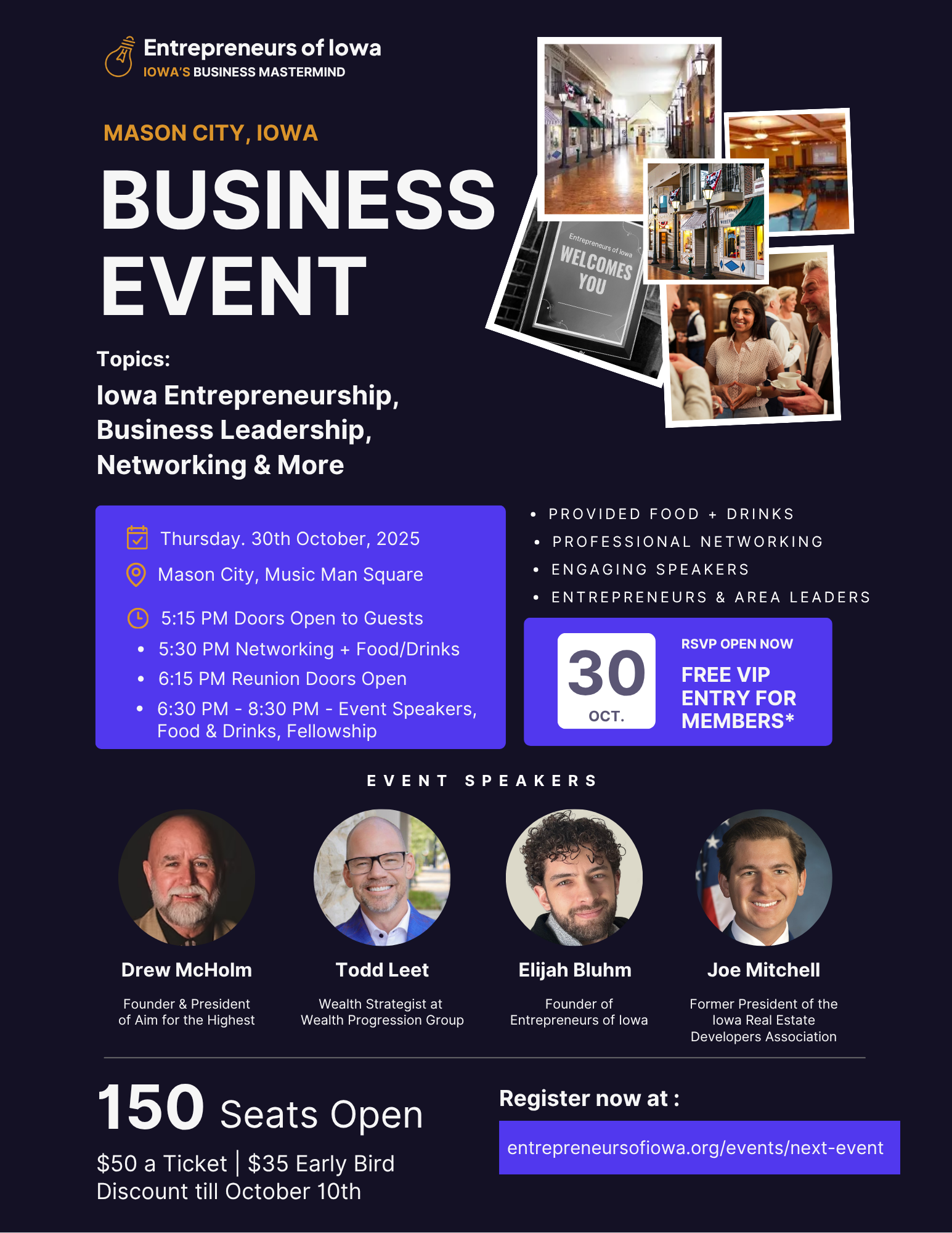 Members of Entrepreneurs of Iowa are holding their next event in Mason City, Iowa, at 5:30 PM at Music Man Square. Enjoy exceptional catered food, guest speakers, and a night of networking with like-minded entrepreneurs.